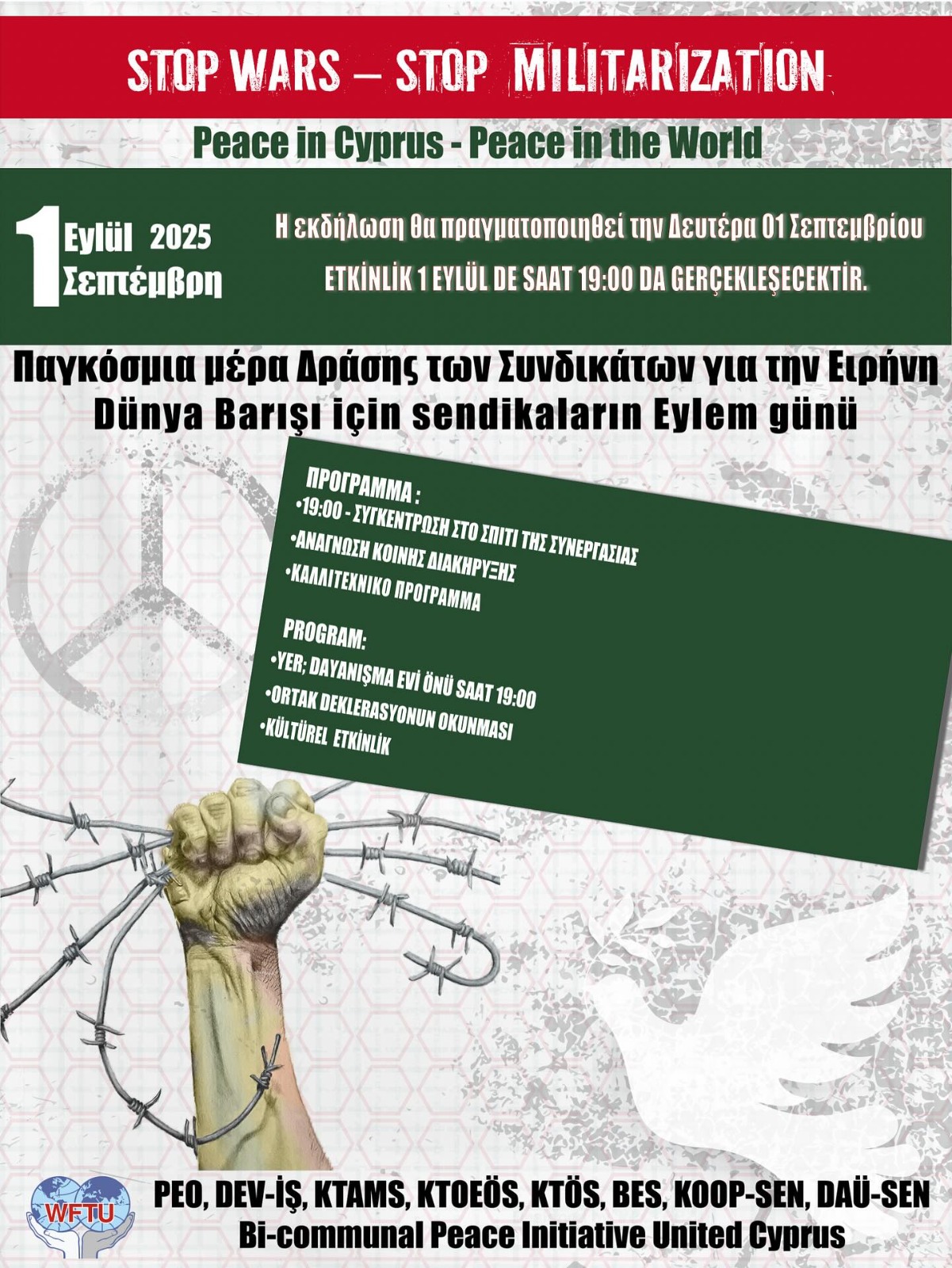Bu bağlamda tüm halkı Dünya Sendikalar Federasyonu’na üye sendikalar DEV-İŞ, KTAMS, KTÖS, KTOEÖS, BES, KOOP-SEN, DAÜ-SEN ve PEO olarak, 1 Eylül’de saat 19.00’da ara bölgede Dayanışma Evi’nde (Home 4 Cooperation) buluşup ortak deklarasyon okunmasına ve kültürel etkinliklere davet ediyoruz.